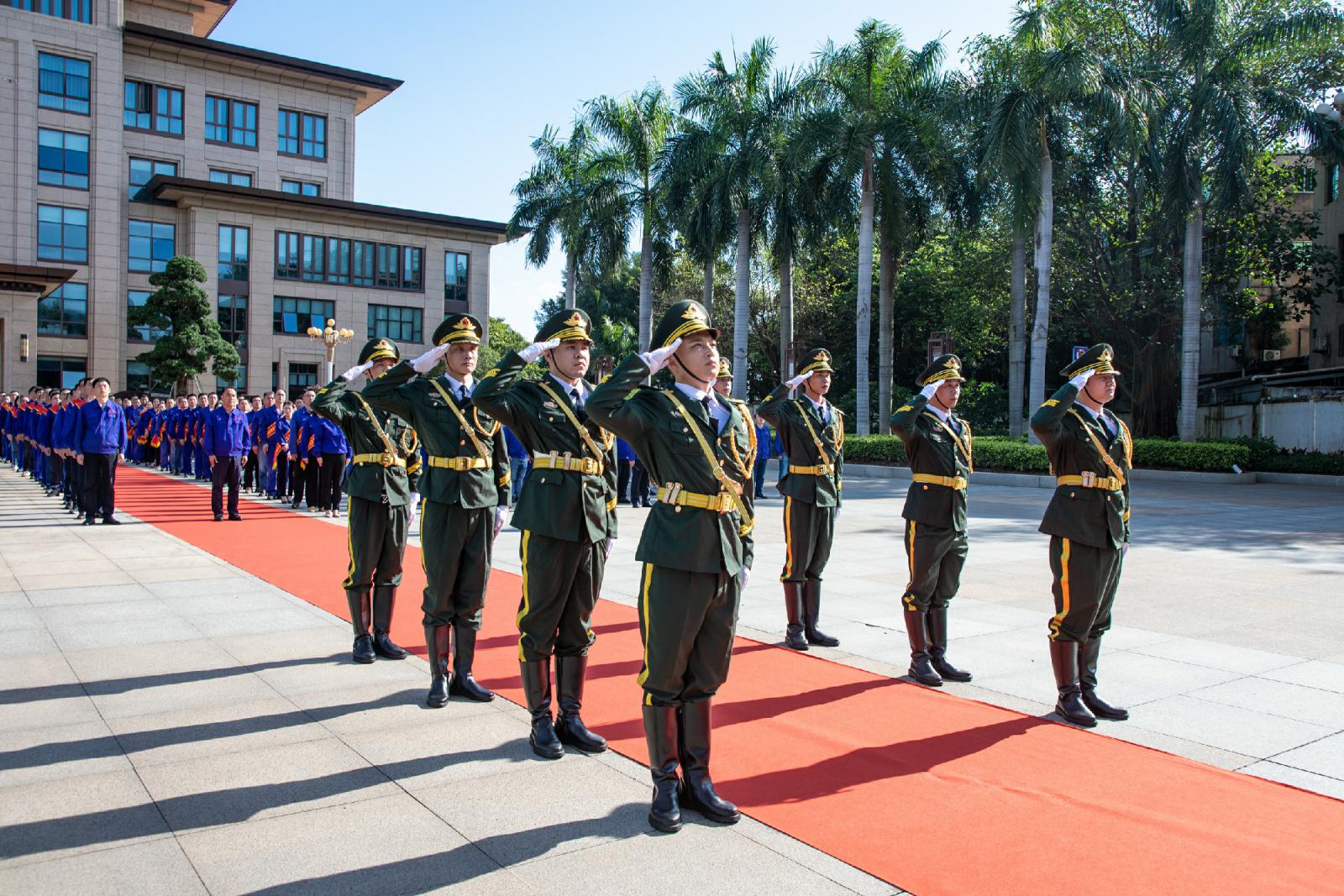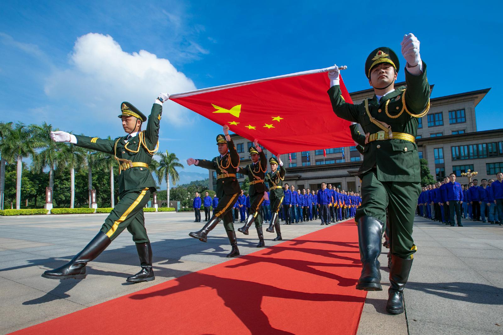 女護(hù)旗手素雅的白裙襯托五星紅旗鮮艷如火,代表著三寶人對(duì)黨純潔的初心,護(hù)旗方陣鏗鏘有力的正步,體現(xiàn)三寶力量與鋼鐵人的擔(dān)當(dāng)。