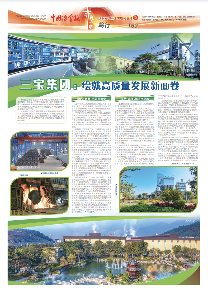通過科技賦能,提升內(nèi)在品質(zhì),三寶集團(tuán)的“三寶”金字招牌享譽(yù)海內(nèi)外。 傳統(tǒng)產(chǎn)業(yè)要有新作為,需以科技為內(nèi)驅(qū)動(dòng)力。三寶集團(tuán)始終把科技創(chuàng)新置于發(fā)展全局的核心位置,并將其作為增強(qiáng)核心競爭力的重要抓手,持續(xù)培育科技新動(dòng)能。從推進(jìn)鋼鐵基礎(chǔ)研究和關(guān)鍵核心技術(shù)攻關(guān),到全方位推動(dòng)科技成果轉(zhuǎn)化和智能制造,三寶集團(tuán)切實(shí)發(fā)揮出了科技創(chuàng)新的戰(zhàn)略支撐作用。