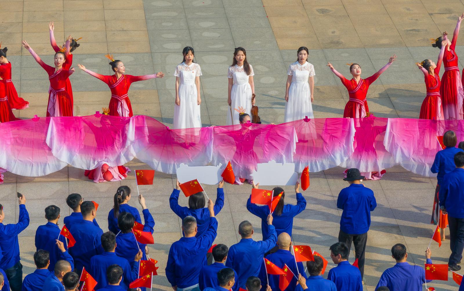 上午8時(shí),升旗儀式正式開始,伴隨著國(guó)旗護(hù)衛(wèi)隊(duì)雄壯的腳步和激昂的國(guó)歌聲,鮮艷的五星紅旗迎著旭日冉冉升起,大家面向國(guó)旗肅立行禮,向國(guó)旗致以最崇高的敬意。緊接著,伴隨著《我和我的祖國(guó)》悠揚(yáng)的小提琴聲音響起,國(guó)慶快閃活動(dòng)正式拉開序幕。三寶各單位代表揮舞著小國(guó)旗,和演員們一起唱響《大中國(guó)》《咱們工人有力量》《紅旗飄飄》,聚集在行政樓廣場(chǎng)的大國(guó)旗下,場(chǎng)上氣氛熱烈、紅旗招展,匯聚起磅礴奮進(jìn)力量,全場(chǎng)大合唱《歌唱祖國(guó)》把活動(dòng)推向高潮,唱出了三寶人對(duì)祖國(guó)的禮贊。