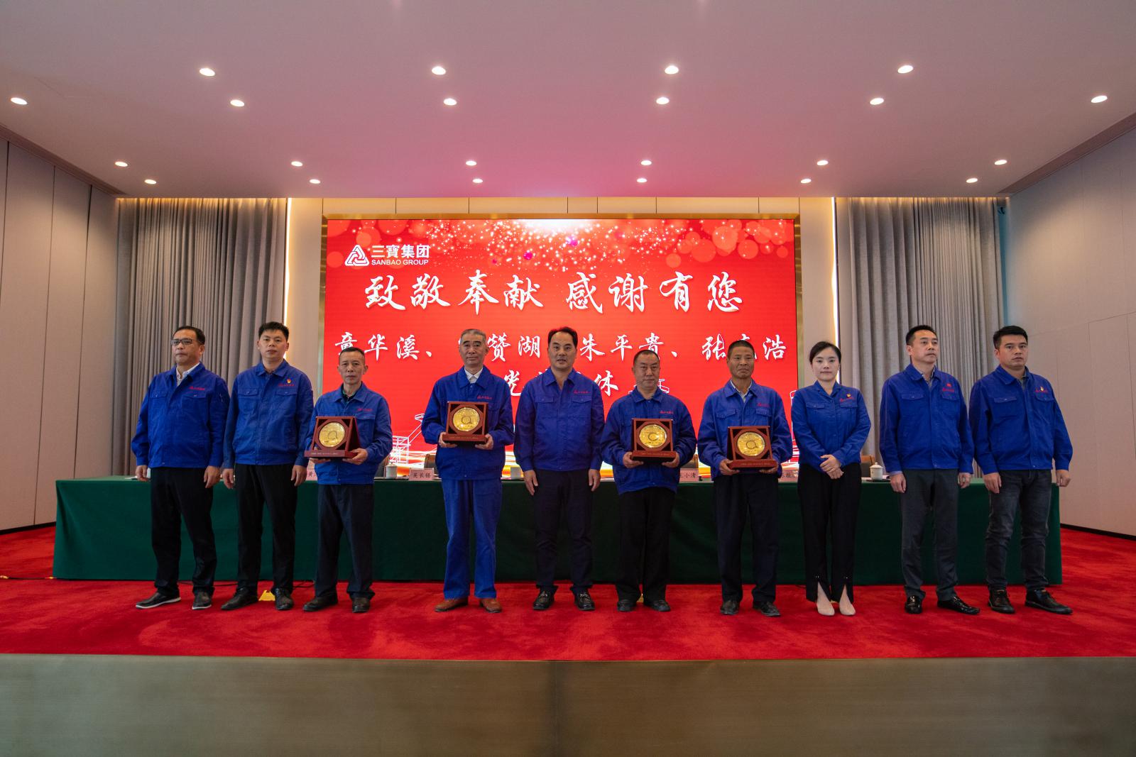 大會還舉行了老員工光榮退休儀式。王董事長為四位工齡滿二十年的老員工章華溪、肖贊湖、朱平貴、張克浩頒發(fā)光榮退休紀(jì)念金牌。