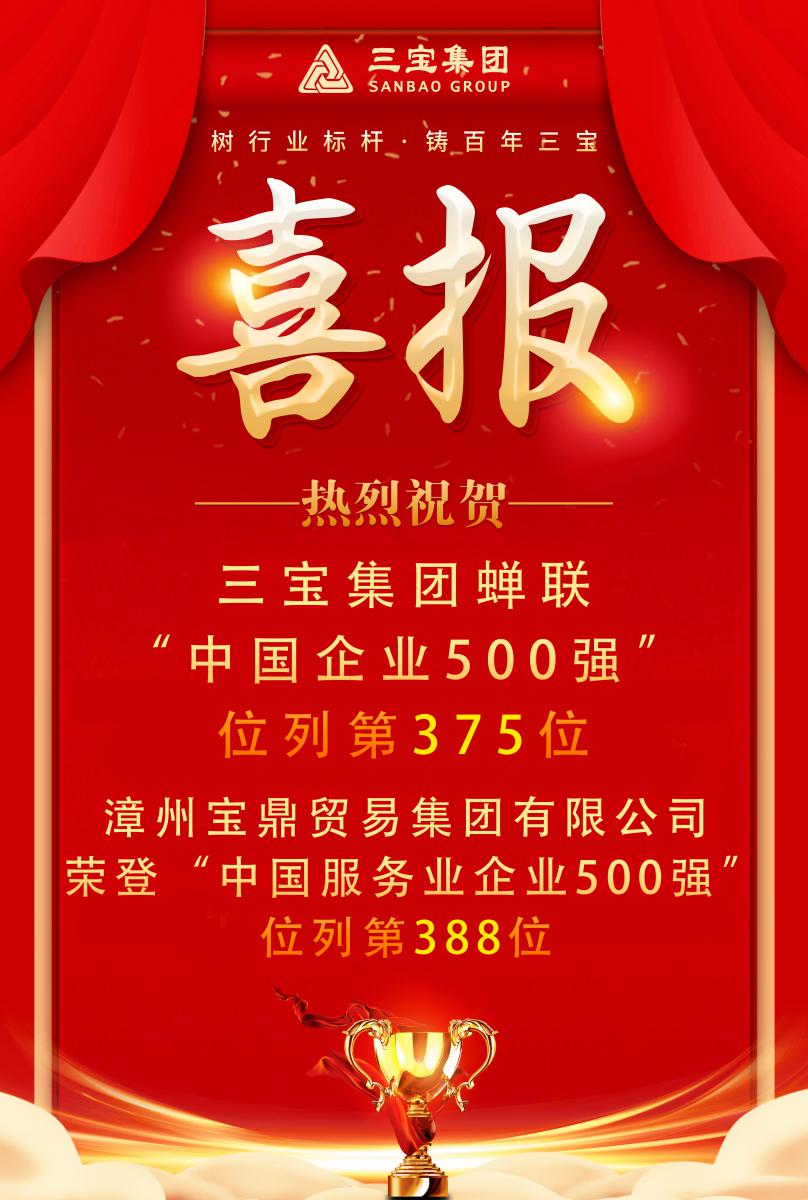 9月11日,中國企業(yè)聯(lián)合會、中國企業(yè)家協(xié)會發(fā)布“2024中國企業(yè)500強(qiáng)”、“2024中國服務(wù)業(yè)企業(yè)500強(qiáng)”榜單,三寶集團(tuán)蟬聯(lián)“中國企業(yè)500強(qiáng)”,位列第375位,較去年提升了72位。同時,三寶“一核兩翼”戰(zhàn)略板塊的漳州寶鼎貿(mào)易集團(tuán)有限公司首次登榜“中國服務(wù)業(yè)企業(yè)500強(qiáng)”,位列第388位。