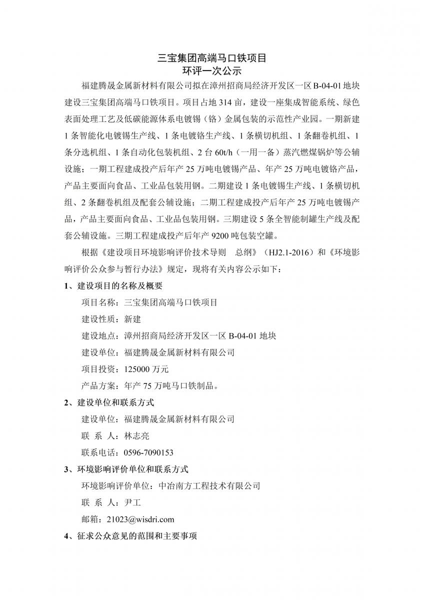 三寶集團高端馬口鐵項目 環(huán)評一次公示
